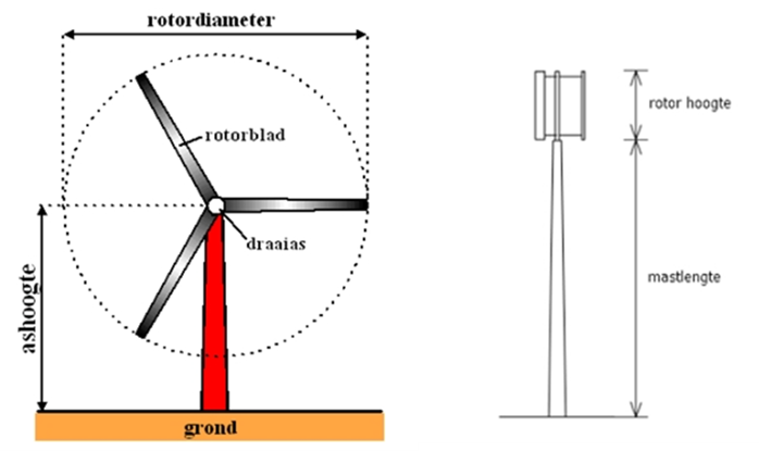 Afbeelding: Links type HAT (horizontale as turbine) en rechts type VAT (verticale as turbine). Bronnen: www.joostdevree.nl en onderzoek toetsingskader kleine windmolens, Onze Joost.
