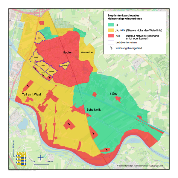 Gemeente Houten omvat gebieden die meer kansrijk zijn (groen), gebieden waar inpassing aan extra regels onderhevig is (oranje) en gebieden waar kleinschalige windturbines bij voorbaat uitgesloten zijn (rood). Dit is afgebeeld middels een “stoplichtenkaart” in bijlage 1 en worden hieronder verder toegelicht.