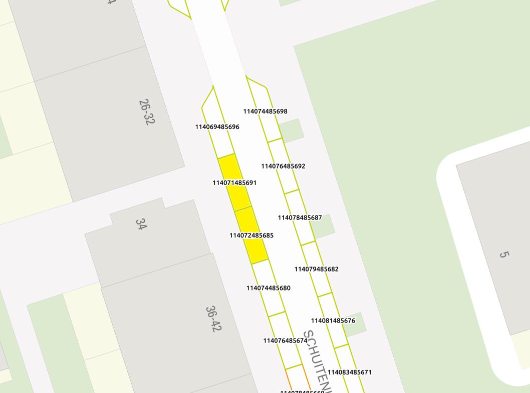 Twee parkeerplaatsen ter hoogte van perceel Schuitenhuisstraat 34 (parkeervaknummers 114071485691 en 114072485685) aan te wijzen voor het opladen van elektrische voertuigen door het plaatsen van een bord conform model E8c van Bijlage I van het RVV 1990, gecombineerd met onderbord OB504 met daarop afgebeeld twee pijlen op een hoek van 45° (RVV 1990).