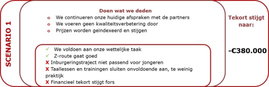 Kijkend naar de kwaliteit en efficiëntie van het huidige beleid zien we dat er ruimte is voor verbetering. In dit scenario kiezen we er echter voor om daar niks mee te doen. We continueren de afspraken met alle partijen. Dit betekent dat de inburgeringsroute voor een deel van de statushouders in de Z-route en de jonge statushouders die geen onderwijsroute volgen, onvoldoende aansluit. Dit gaat ten koste van de integratie van deze statushouders in onze gemeente. Verbeteringen, zoals voorgesteld in scenario 2, zijn nodig om de inburgering beter te laten aansluiten op de behoefte en mogelijkheden van onze statushouders. Daarnaast zorgt scenario 1 voor een forse stijging van het financiële tekort zonder uitzicht op een verlaging van dit tekort.