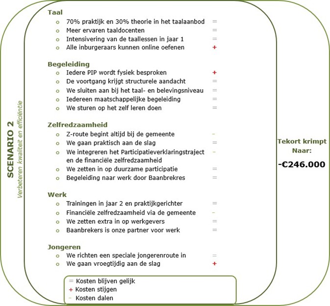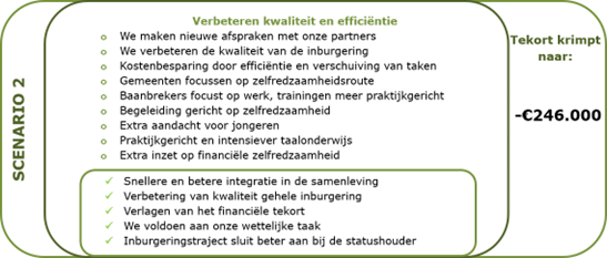 We kiezen ervoor om de kwaliteit te verhogen en het tekort te verlagen. Daarmee kunnen we onze wettelijke taak uitvoeren, statushouders beter begeleiden, de integratie bevorderen en de kosten verlagen ten opzichte van scenario 1. Tijdens de uitvoering van de evaluatie hebben we veel gesprekken gevoerd en input opgehaald. Deze opbrengsten vormen de basis voor scenario 2. In dit scenario hebben we de focus op de verbetering van de kwaliteit, verhogen van de efficiëntie en het lagen van het financiële tekort. Scenario 2 bestaat uit vijf pijlers welke de basis vormen voor het beleid en de uitvoering van de Wet inburgering de komende jaren.