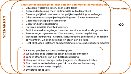 In scenario 3 hebben we de maatregelen bekeken die nodig zijn om geen financieel tekort meer te hebben. Dat betekent dat de beschikbare middelen leidend zijn. Er zijn ingrijpende maatregelen nodig om het tekort op te lossen. Maatregelen die de statushouders raken, maar ook de (lokale) samenleving. Dingen die we aanvullend op de wettelijke verplichtingen doen, gaan we beëindigen. Statushouders worden niet extra ondersteund op financiële zelfredzaamheid, de kans op schulden neemt toe. Ook is er geen ruimte meer voor maatwerk in de begeleiding. Statushouders zijn daardoor meer op zichzelf aangewezen, dit zal resulteren in problemen in de integratie.