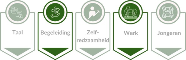 We hebben ervoor gekozen om te werken met vijf pijlers voor de inburgering de komende jaren. Deze vijf thema’s brengen de focus aan in het nieuwe beleid. Thema’s die we terug horen in de gesprekken met statushouders en professionals in de uitvoering. Door aan de slag te gaan met deze thema’s kunnen we de kwaliteit van de inburgering verder verbeteren en daarmee zorgen voor een betere integratie van statushouders in Waalwijk. Later in dit beleidsplan werken we de financiën verder uit en lichten we deze toe.