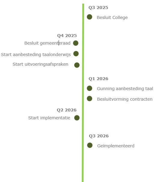 We gaan aan de slag met de uitgangspunten uit dit beleidsplan. Om over te gaan tot uitvoering starten we met het maken van uitvoeringsafspraken met onze partners, daarnaast moet het taalonderwijs opnieuw worden aanbesteed. Hiervoor gaan we zaken in gang zetten. Om over te gaan tot implementatie hanteren we de volgende planning waarbij we onze partners voldoende tijd geven om aanpassingen te doen: