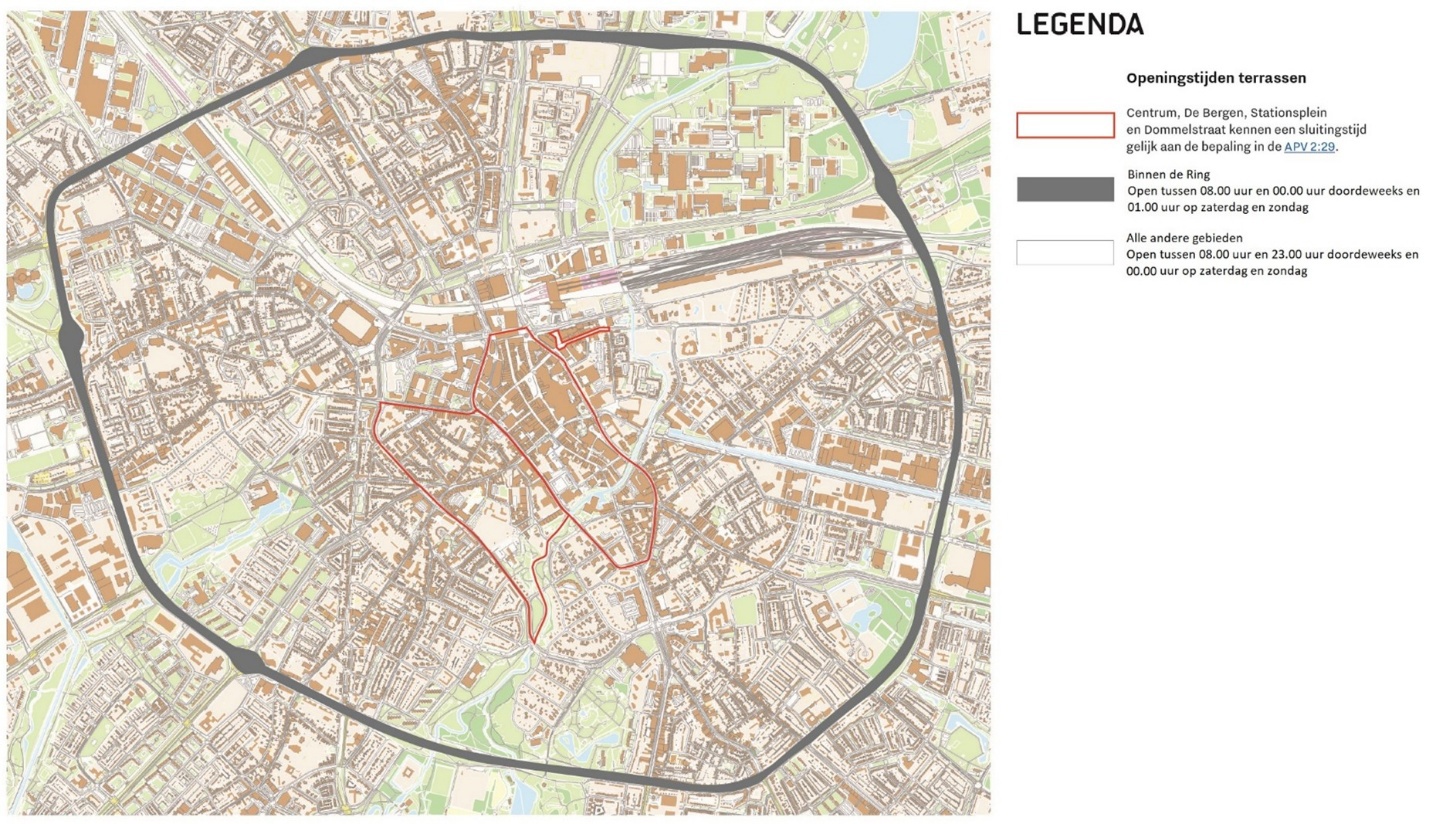 Bij de actualisatie van de terrasregels is het uitgangspunt dat er een goede balans is tussen levendigheid en leefbaarheid. De transitie van ‘place to buy’ naar ‘place to be and to live’ is zichtbaar in zowel de binnenstad als (even) daarbuiten. Dit gaf aanleiding om kritisch te kijken naar de openingstijden van terrassen en om tot een ontwikkeling te komen die past bij de vijfde grootste stad van Nederland. Hierbij erkennen we naast de economische, ook de sociaal-maatschappelijke belangen van een terras. Een terras heeft een functie in de wijk waarbij het ook dient voor 'ogen op straat'. Dit draagt bij aan de veiligheid en sociale controle in een buurt. Hoewel een gedeelte van de bezoekers van terrassen in dit gebied, tevens bewoners zijn dient er aandacht te blijven voor een prettige leefomgeving. Een goede manier om deze balans te vinden, is door het opstellen van duidelijke regels en hierbij een beroep te doen op de verantwoordelijkheid van ondernemers en hen afspraken te laten maken ten aanzien van het terras. Om hier een stap in te zetten, verruimen we de openingstijden van terrassen in het gebied binnen de Ring. Terrassen in dit gebied mogen doordeweeks tot 00.00 uur geopend zijn en tot 01.00 uur in het weekend. Deze verruiming is onder meer gebaseerd op resultaten van verkennende gesprekken tussen ondernemers en de directe omgeving. De samenstelling van de bevolking in het gebied binnen de Ring verandert immers en daarmee ook de wensen en gebruiken van die bewoners. De verdichting van het woningaanbod zorgt voor meer eenpersoonshuishoudens naast en in plaats van gezinnen en dat betekent een grotere vraag naar voorzieningen. Meer (kleinere) woningen voor eenpersoonshuishoudens betekent ook een grotere vraag naar plekken waar men kan afspreken, ontmoeten en simpelweg ‘buiten kan zijn’. Bij de lange en warme zomers van voorgaande jaren, bleek dat horecaterrassen belangrijke plekken zijn om elkaar buiten te kunnen ontmoeten. Ook in het gebied buiten de Ring realiseren we een verruiming in het weekend. Terrassen in dit gebied mogen doordeweeks tot 23:00 uur geopend zijn en tot 00:00 in het weekend.