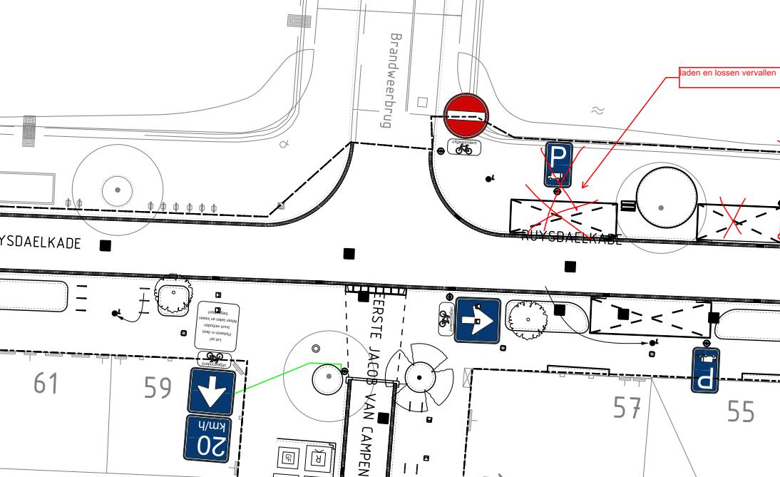 één van de te besluiten maatregelen een voorziening voor het direct laden en lossen van goederen aan de Ruysdaelkade, tegenover perceel 57 ter hoogte van de Brandweerburg is;
