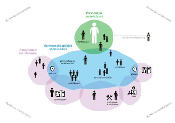 De inwoner en diens netwerk. Inwoners kunnen een (hulp)vraag hebben, maar ook ideeën of initiatieven. Soms word je mantelzorger voor een naaste. Dit overkomt je en doe je op basis van jouw persoonlijke relatie met diegene. 1 De overheid heeft geen bemoeienis met de persoonlijke sociale basis. Het is één op één contact tussen inwoners, zonder formele vorm van organisatie. |