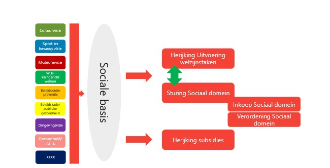 Daarnaast helpt het denkkader bij de uitwerking en implementatie van plannen en processen die vanaf nu worden opgepakt. En het helpt om consequente keuzes te kunnen (blijven) maken. Momenteel werkt de gemeente aan het onderzoek naar de herijking van de welzijnstaken, de subsidieherijking, Sturing Sociaal Domein, de Inkoop en de verordening Sociaal Domein. Schematisch kan dit als volgt worden weergegeven: