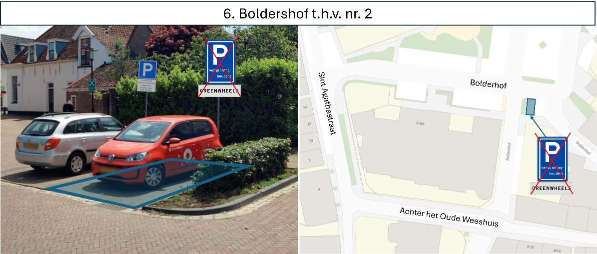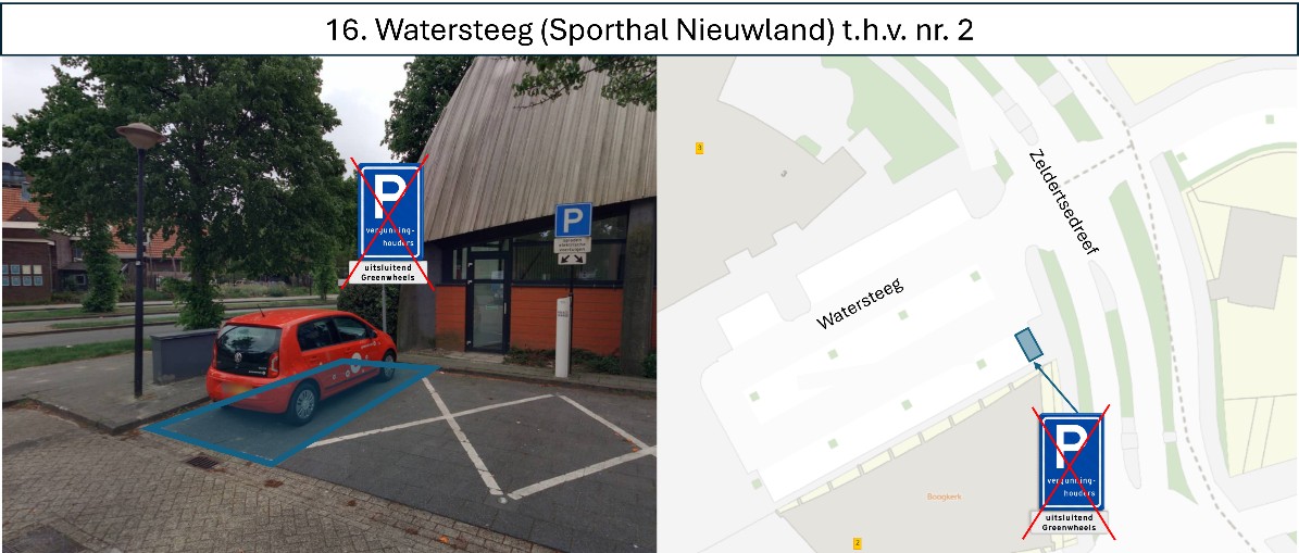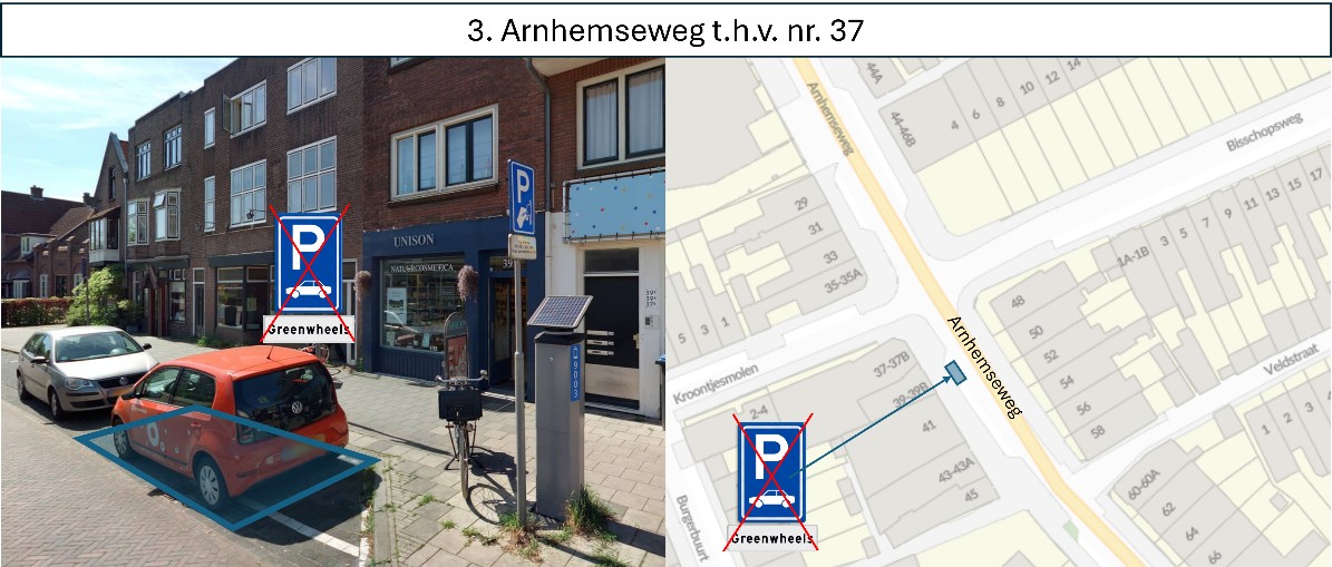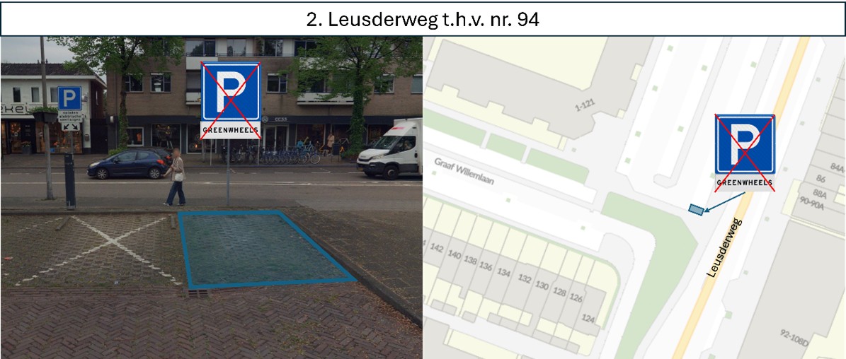 2. door middel van het plaatsen van het verkeersbord E8 (symbool auto) van bijlage 1 van het RVV 1990, in combinatie met een onderbord met daarop de naam van de betreffende aanbieder van de deelauto en, indien van toepassing, een onderbord met pijlen waaruit blijkt dat het bord voor twee parkeerplaatsen van toepassing is, op de volgende locaties een gereserveerde parkeerplaats voor een deelauto aan te wijzen: