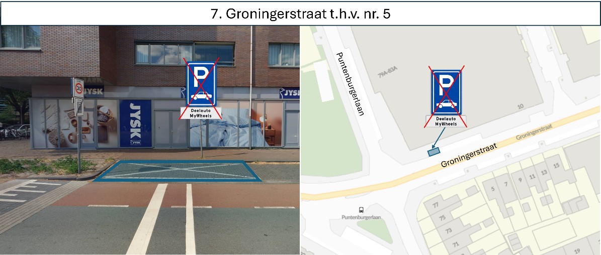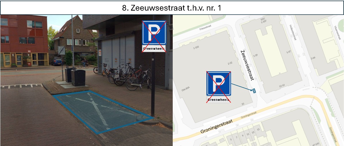 1. door middel van het verwijderen van de verkeersborden E8 van bijlage 1 van het RVV 1990 met een onderbord met de tekst ‘Aanbieder deelauto’, evenals door het verwijderen van onderborden onder verkeersbord E9 met de tekst ‘Aanbieder deelauto’, op de volgende locaties de gereserveerde parkeerplaats voor deelauto’s op te heffen: