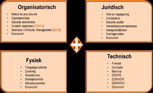 Om zorg te kunnen dragen voor de beschikbaarheid, vertrouwelijkheid en integriteit van de informatievoorziening is het noodzakelijk om een samenhangend pakket van organisatorische-, juridische-, technische- en fysieke informatiebeveiligingsmaatregelen te treffen en te onderhouden. Informatieveiligheid reikt verder dan het implementeren van technische informatiebeveiligingsmaatregelen. Het is een groot misverstand om te denken dat informatiebeveiliging iets technisch is dat centraal geregeld kan of moet worden. Hieronder wordt schematisch weergegeven binnen welke domeinen maatregelen voor informatiebeveiliging worden getroffen en onderhouden. De beschreven maatregelen binnen deze domeinen zijn illustratief en niet limitatief.