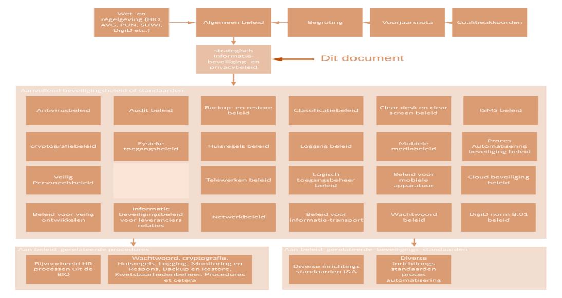 Het IB-beleid 25-29 vormt de kapstok voor (de uitwerking van) aanvullend onderliggend informatiebeveiligingsbeleid, tactische en operationele richtlijnen, processen, procedures en maatregelen. Dit wordt hieronder schematisch weergegeven. De daaruit voortkomende prioriteiten en werkzaamheden worden uitgewerkt in het jaarlijks op te stellen “Informatiebeveiligingsplan Drechtsteden 202X”. De inhoud en structuur van het IB-beleid 25-29 zijn gebaseerd op de Baseline Informatiebeveiliging Overheid (BIO). Ook het “Informatiebeveiligingsplan Drechtsteden 202x” zal worden gebaseerd op de BIO.