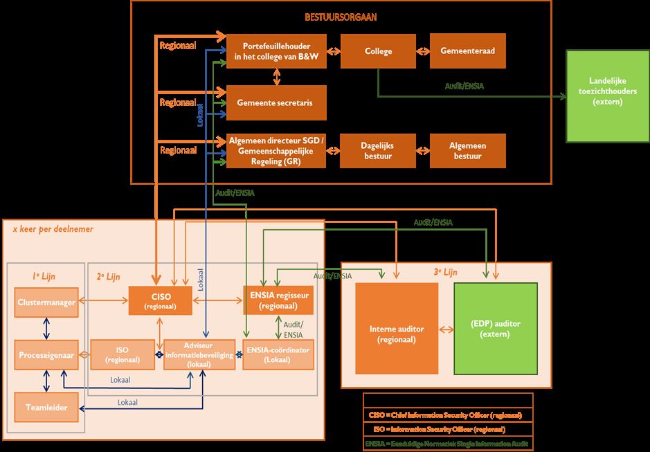De indeling van de informatiebeveiligingsorganisatie binnen het samenwerkingsverband Drechtsteden sluit aan op de uitwerking van het “Three Lines Model” (eerder bekend als “Three Lines of Defense”). In dit model is het bestuursorgaan eindverantwoordelijk voor de integrale informatiebeveiliging, de inrichting en werking van de informatiebeveiligingsorganisatie en voor de implementatie van alle informatiebeveiligingskaders in de organisatie, dus ook voor een juiste toepassing van de BIO. De eerste lijn, het lijnmanagement (proceseigenaar), is verantwoordelijk voor het zorg dragen voor de informatiebeveiliging en privacybescherming binnen de eigen processen. De tweede lijn (CISO, regionale ISO, lokale adviseur informatiebeveiliging, regionale ENSIA regisseur en de lokale ENSIA coördinator) ondersteunt, adviseert, coördineert en bewaakt of het lijnmanagement (proceseigenaar) zijn/haar verantwoordelijkheden ook daadwerkelijk neemt. De derde lijn bestaat uit een interne auditor en een (externe) register EDP-auditor. De derde lijn geeft onafhankelijke en objectieve adviezen (interne auditor) en Assurance (register EDP-auditor) over de toereikendheid en effectiviteit van de informatiebeveiliging en het bijbehorende risicomanagement. De indeling van de informatiebeveiligingsorganisatie binnen het samenwerkingsverband Drechtsteden wordt hieronder schematisch weergegeven.