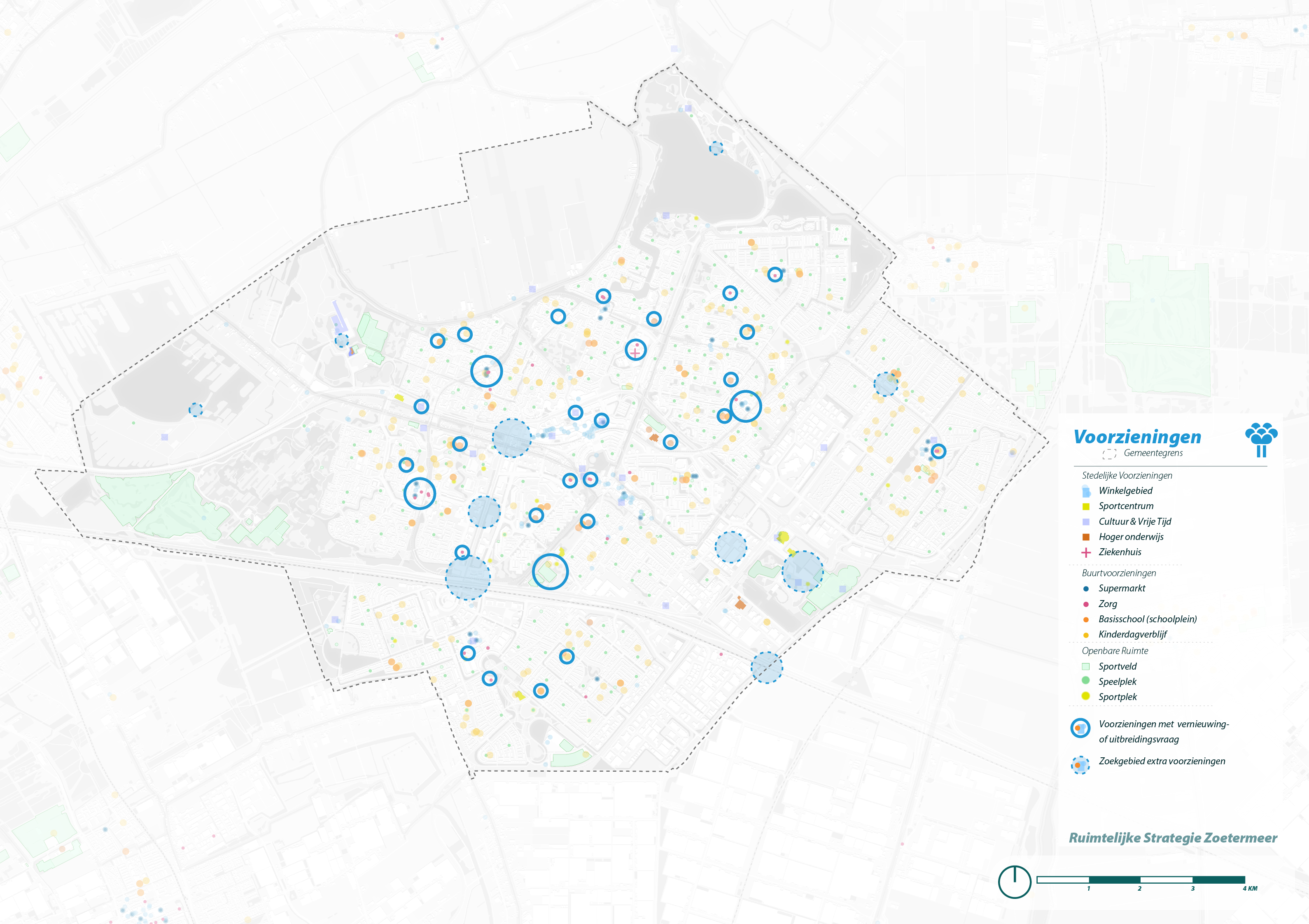 Functies die voorzien in een basisbehoefte en ondersteunend zijn voor het prettig functioneren van een stad. Daarbij wordt onderscheidt gemaakt tussen verschillende soorten voorzieningen. Stedelijke voorzieningen die bijdragen aan de levendigheid, zoals sport- en culturele voorzieningen (sportscholen, theaters, bioscopen, musea), een ruim retail aanbod en horecagelegenheden. Daartoe horen ook stedelijke voorzieningen zoals sporthallen en middelbare scholen en grotere zorgvoorzieningen die wijkoverstijgend functioneren. Maatschappelijke voorzieningen voor ontmoeting en ontplooiing (incl. wijkevenementen) in de wijk en onder dagelijkse voorzieningen worden basisscholen, kinderopvang, zorg en maatschappelijke voorzieningen in de buurt verstaan.