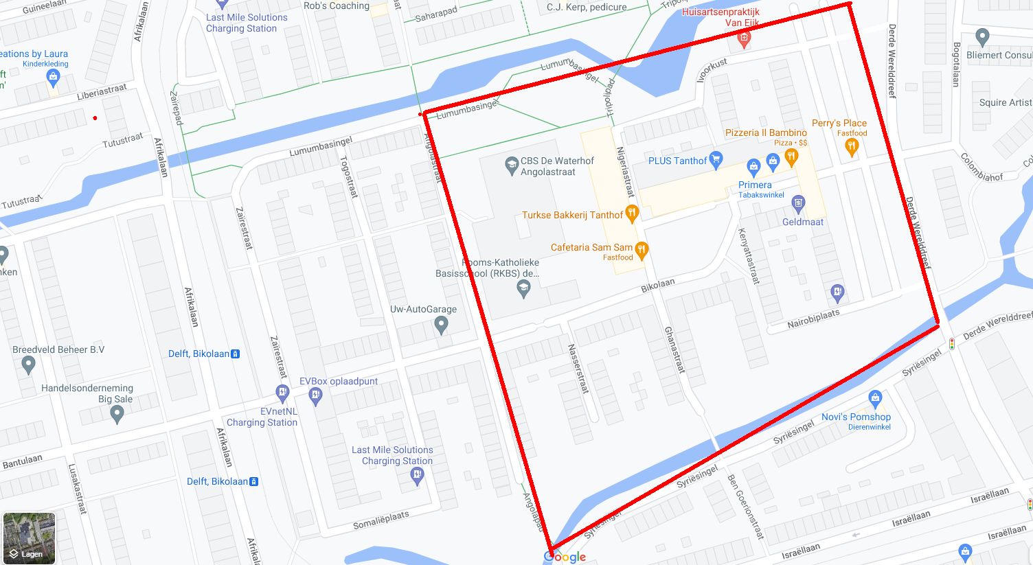 • kruising Angolastraat-Lumumbasingel overgaande in Angolastraat, overgaande in Angolapad in rechte lijn tot aan het water, in rechte lijn langs het water tot Derde Werelddreef, in rechte lijn langs Derde Werelddreef tot en met Ivoorkust en van Ivoorkust in rechte lijn tot aan kruising Lumumbasingel-Angolastraat, zoals ook aangegeven op de bij dit besluit horende indicatieve kaart,