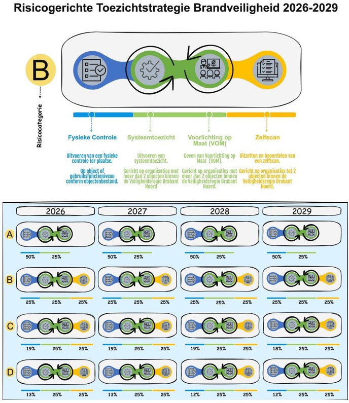 De Risicogerichte Toezichtstrategie Brandveiligheid 2026-2029 bestaat uit een mix van interventies: