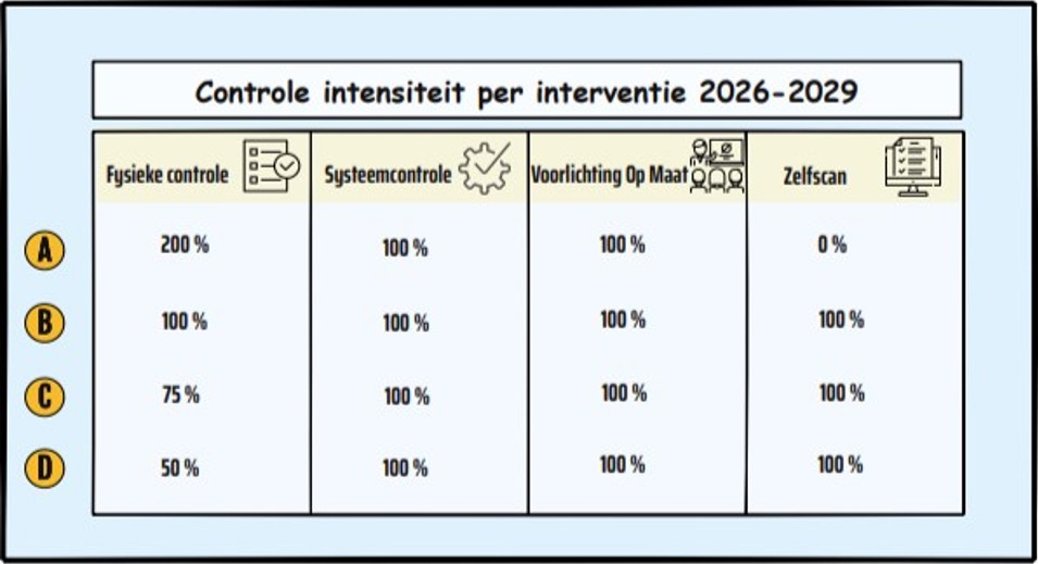 Door de interventies te combineren ontstaat een gevarieerde vierjarige cyclus waarin zowel toezichthoudende instrumenten als gedrag beïnvloedende instrumenten worden ingezet. In Figuur 4 is per risicocategorie (A t/m D) weergegeven hoe de vierjarige cyclus eruit gaat zien. De uitkomsten van een fysieke controle, systeemcontrole en zelfscan zullen worden gebruikt als input voor de voorlichtingen.