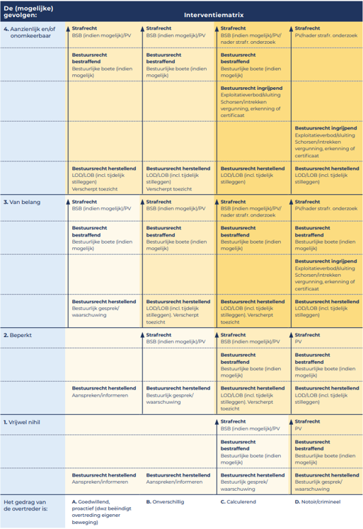 Als de constatering is toegekend aan een vak in de matrix, is de volgende stap het vaststellen of overleg met de politie en het OM noodzakelijk is voor een strafrechtelijk optreden. Dit zal het geval zijn bij valsheid in geschrifte, corruptie of witwassen. Ook als sprake is van situaties waarin bewust het toezicht onmogelijk wordt gemaakt, zoals bij het weigeren van de toegang, intimidatie, geweldsdreiging, fraude, vernietiging van bewijs en poging tot omkoping, en situaties waarin de toezichthouder constateert dat er opzettelijk mensen in gevaar worden gebracht door bijvoorbeeld sabotage, vernieling of het bewust verstrekken van verkeerde informatie, kan strafrechtelijk optreden noodzakelijk zijn. Overeenkomstig de LHSO wordt in die situaties altijd aangifte gedaan. Is daar geen sprake van, dan wordt volstaan met bestuurlijk opgetreden. Of er inzet en afstemming nodig is met instanties die belast zijn met strafrechtelijk optreden, wordt per casus bekeken.