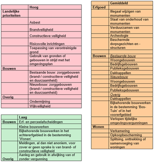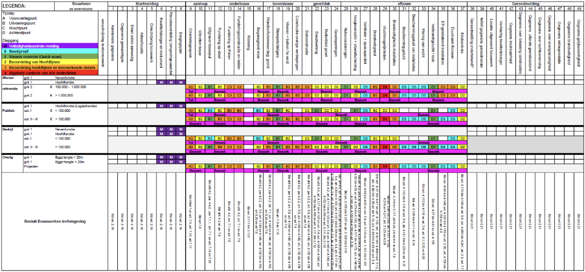 De casemanager van de gemeente Zeist kan zich daarom beperken tot het toetsen van die zaken die het meest risicovol zijn. Dit kan gaan om branches of activiteiten waarbij de kans op overtreding van de wet groter is (zoals asbestsaneringen), en/of om onderwerpen die tot grote negatieve effecten kunnen leiden (constructieve veiligheid en brandveiligheid). Uitgangspunt hierbij zijn de aan de verschillende gebouwcategorieën toegekende toetsniveau’s van de Landelijke Toetsmatrix Bouwbesluit welke zijn vertaald naar het Besluit bouwwerken leefomgeving. Zo wordt de kans dat risicovolle activiteiten worden gemist, verkleind en wordt eveneens voorkomen dat veel tijd en energie gestoken wordt in activiteiten of uitvoerders die niet of nauwelijks tot risico’s leiden.