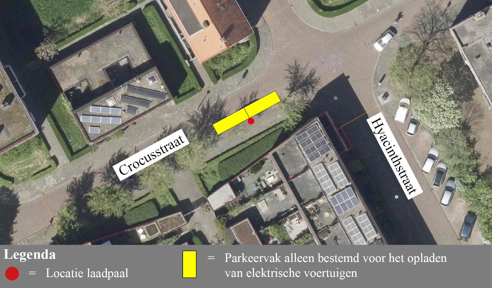 Wij besluiten op grond van bovenvermelde overwegingen twee parkeervakken, bij de laadpaal aan de Crocusstraat aan de zijkant van Hyacinthstraat 104-26, aan te wijzen als parkeervakken alleen bestemd voor het opladen van elektrische voertuigen middels plaatsing van bord E8c uit bijlage 1 van het Reglement verkeersregels en verkeerstekens 1990 met een onderbord (conform artikel 8 BABW) met daarop pijlen, waaruit blijkt dat het bord voor twee parkeervakken van toepassing is.