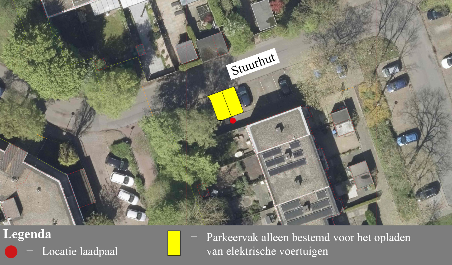 Wij besluiten op grond van bovenvermelde overwegingen twee parkeervakken, bij de laadpaal aan de Stuurhut ten noorden van nummer 47, aan te wijzen als parkeervakken alleen bestemd voor het opladen van elektrische voertuigen middels plaatsing van bord E8c uit bijlage 1 van het Reglement verkeersregels en verkeerstekens 1990 met een onderbord (conform artikel 8 BABW) met daarop pijlen, waaruit blijkt dat het bord voor twee parkeervakken van toepassing is.