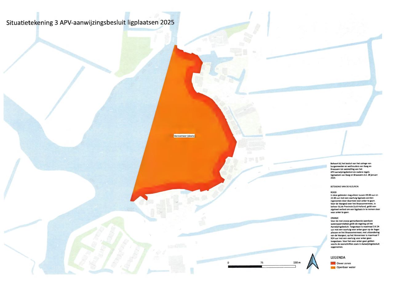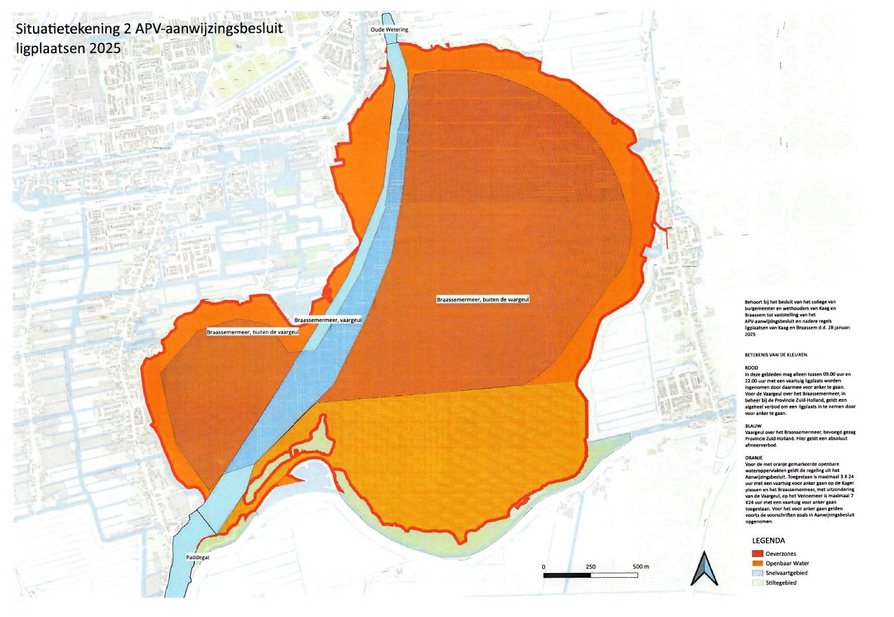 - de Kager plassen en het Braassemermeer met uitzondering van de Vaargeul, zoals rood en oranje aangegeven op de bij dit besluit behorende situatietekeningen;