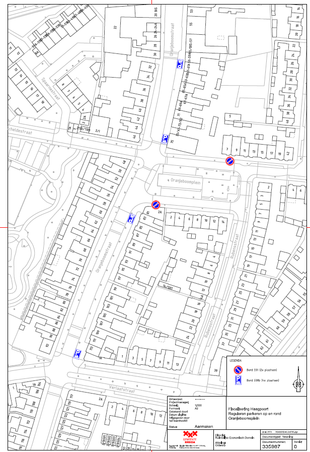 Aan de oostzijde van de Oranjeboomstraat, ter hoogte van de huisnummers 83 t/m 113 en 61 t/m 75, parkeren met twee wielen op het trottoir toe te staan. En op het Oranjeboomplein, ter hoogte van de huisnummers 2A en 7, een parkeerverbod in te stellen. Een en ander zoals weergegeven op de bijgevoegde tekening ‘Fiscalisering Haagpoort Reguleren parkeren op en rond Oranjeboomplein’.
