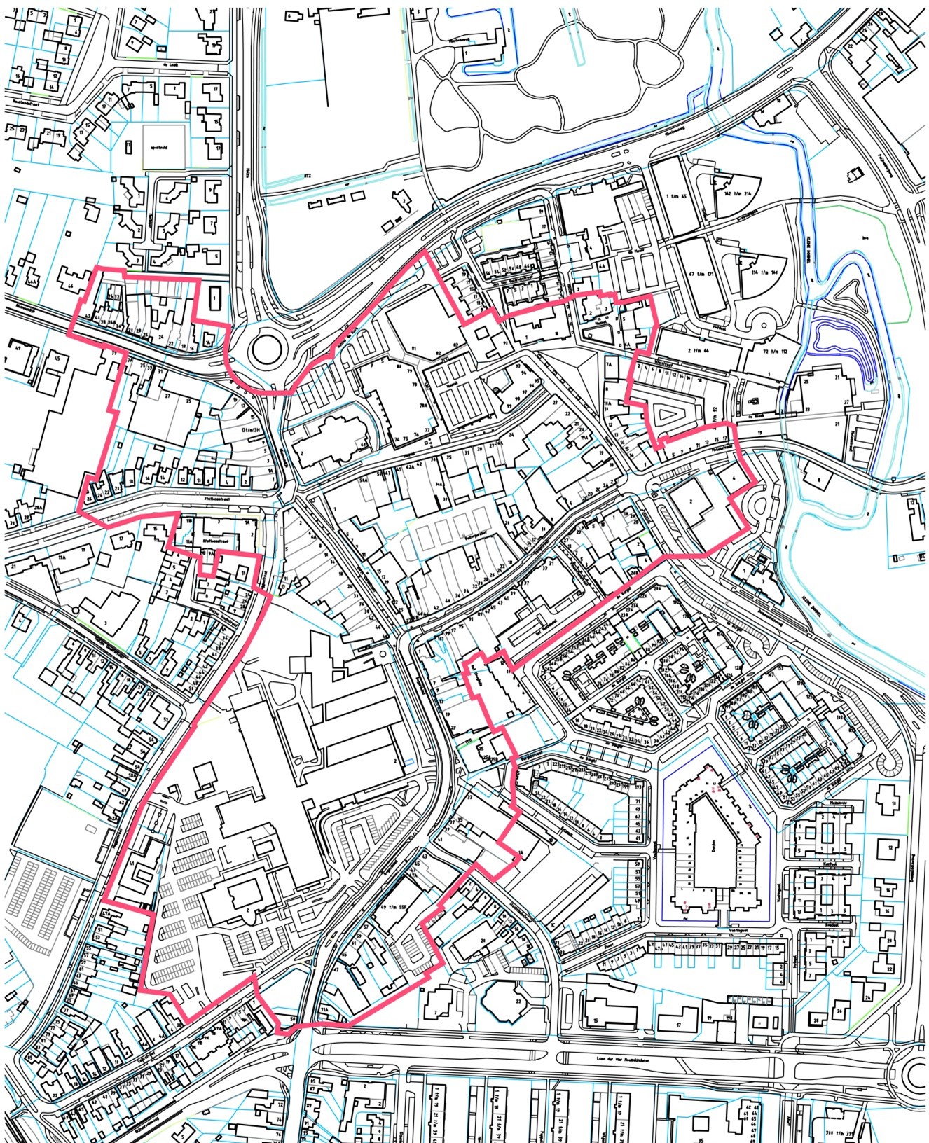 Het gebied waarop de verordening van toepassing is wordt begrensd door de straten als volgt aangeduid: