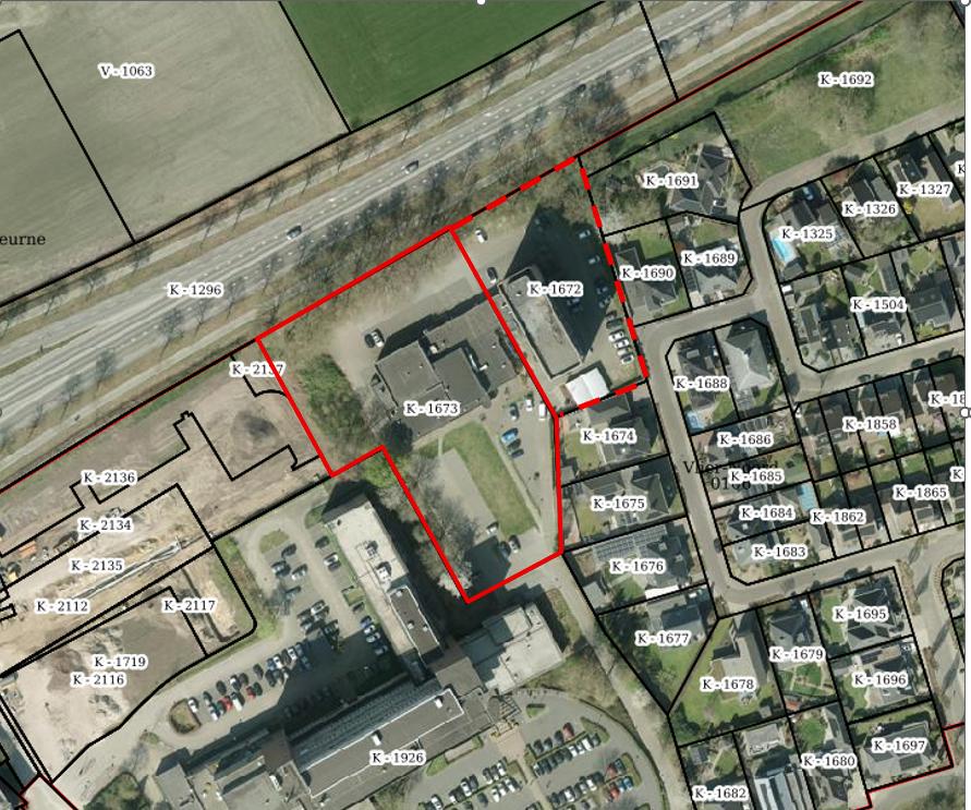 Fig.: luchtfoto met plangebied en te herinrichten (parkeer)terrein aan oostzijde