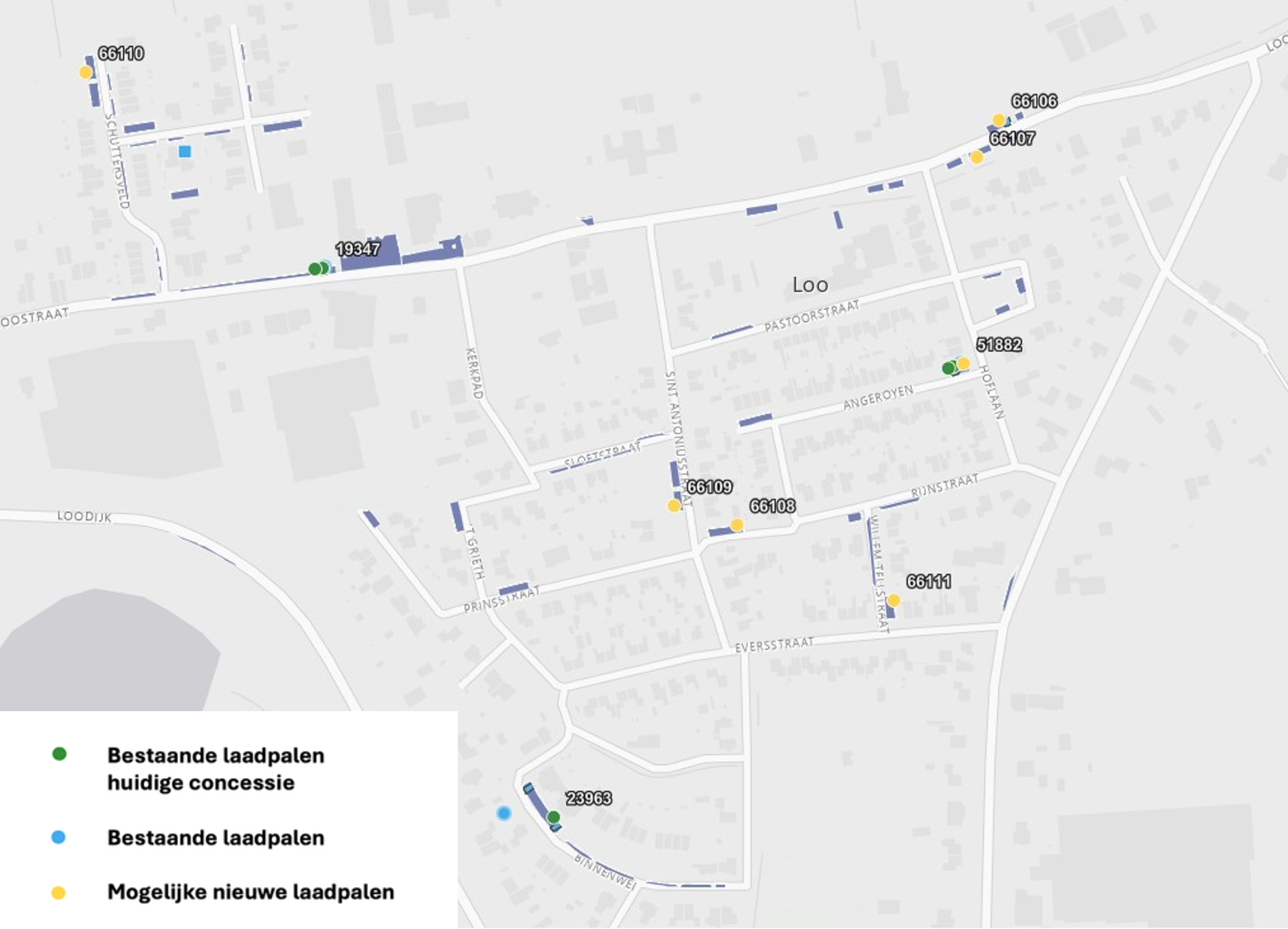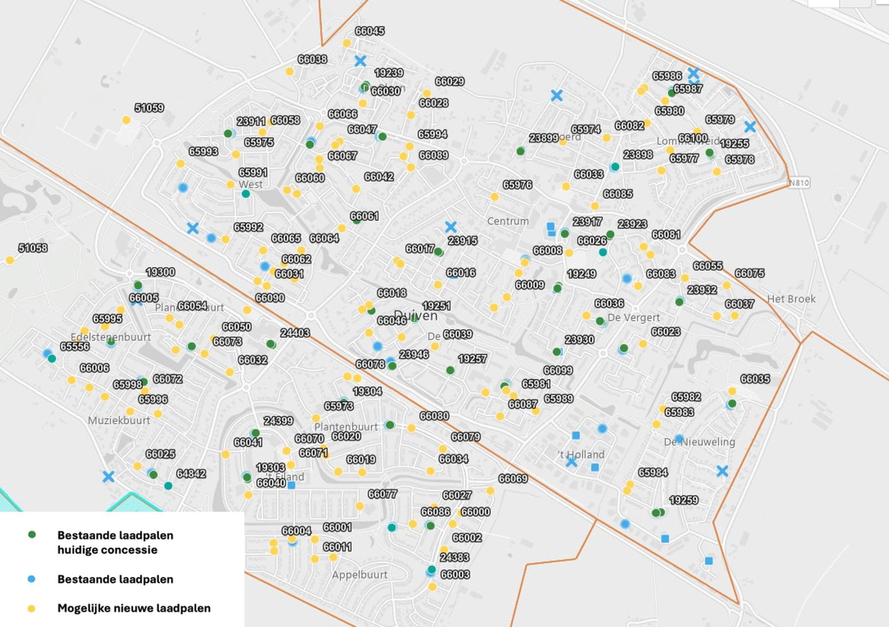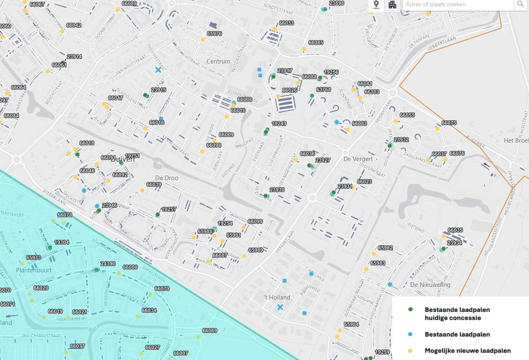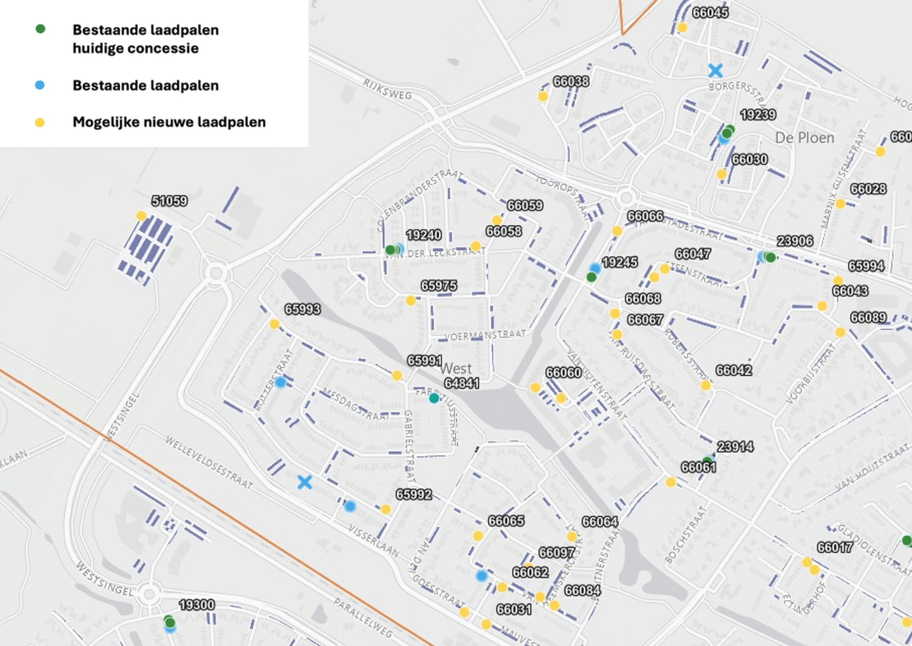 Op de plankaart worden de publieke laadpalen weergegeven in onze gemeente. De gele locaties zijn de plekken waar de komende jaren een laadpaal kan komen te staan als er een aanvraag komt, als een laadpaal veel gebruikt wordt, of als we proactief locaties bijplaatsen. De bestaande laadlocaties zijn weergegeven in blauw (eerder geplaatst) en groen (geplaatst in de huidige concessieperiode).