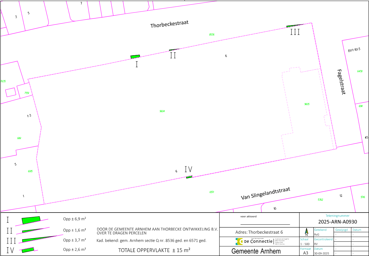 De gemeente Arnhem is voornemens over te gaan tot uitgifte van 4 snippers grond van in zijn totaal circa 15 m2 groot, zoals aangeven op bijgaande tekening met nummer 2025-ARN-0930, aan Thorbecke Ontwikkeling B.V. Het betreft deelpercelen van kadastraal bekend als gemeente Arnhem, sectie Q, nummer 6571 en nummer 8536. De uitgifte maakt onderdeel uit van de realisatie van een woningbouwproject van circa 180 woningen. De deelpercelen zijn gelegen aan de Thorbeckestraat en de Van Slingelandstraat.