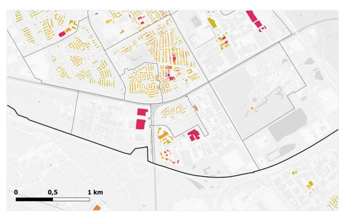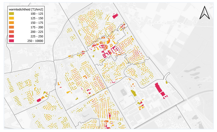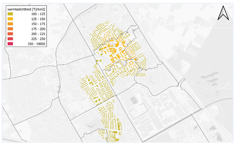 Vervolgens is een warmtedichtheidsanalyse uitgevoerd. Deze kijkt naar de geconcentreerde warmtevraag in verschillende delen van Best. Als referentiepunt wordt één pand genomen. De analyse kijkt vervolgens vanuit dat pand hoe groot de warmtevraag in een bepaalde straal om het gebouw heen is. Hoe groter de bebouwingsdichtheid, hoe groter ook de geconcentreerde warmtevraag is, en dat maakt een warmtenet aanleggen relatief rendabeler.