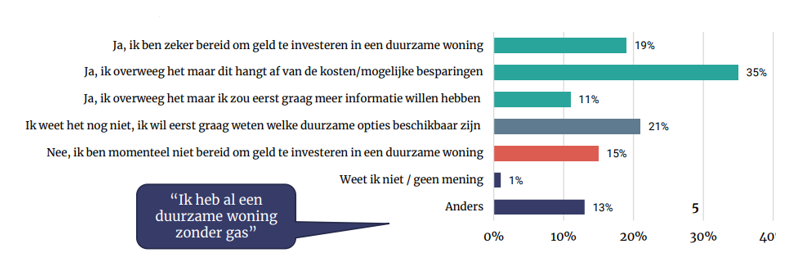 Op de vraag of inwoners bereid zijn om geld te investeren in een duurzame woning, antwoord één op de vijf inwoners (19%) hier zeker toe bereid te zijn. Iets minder dan de helft (46%) zegt dit te overwegen. Vijftien procent van de inwoners zegt momenteel niet bereid te zijn om geld te investeren in een duurzame woning.