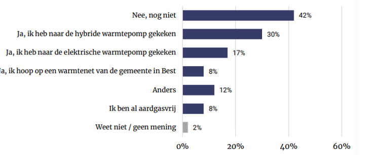 Twee op vijf inwoners (42%) zeggen nog niet te hebben gekeken naar opties voor duurzame verwarming in hun eigen woning. Een derde van de inwoners (30%) geeft aan gekeken te hebben naar een hybride warmtepomp.