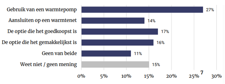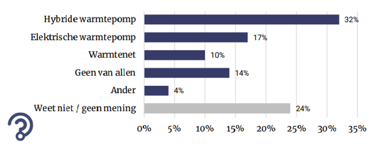 De optie die volgens inwoners het beste bij de eigen woning past, is een hybride warmtepomp (32%). Een kwart van de inwoners (24%) zegt hier geen mening over te hebben of dit niet te weten. Als inwoners konden kiezen tussen een warmtepomp of een aansluiting op een warmtenet, gaat de voorkeur vaker uit naar een warmtepomp (27%).