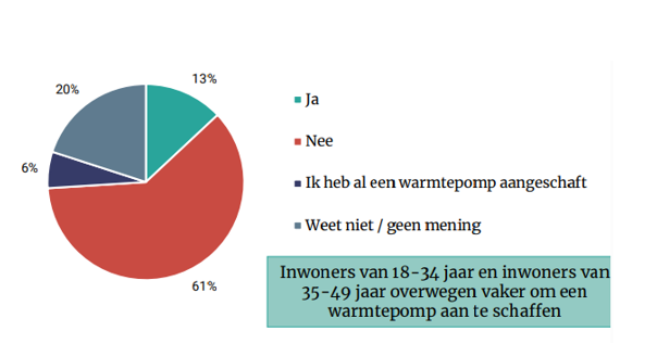 Drie op de vijf inwoners (61%) geven aan de aanschaf van een warmtepomp niet te overwegen. Redenen om dit niet te doen zijn de investeringskosten, geen geschikte woning en overlast van het geluid dat een warmtepomp maakt. Dertien procent van de inwoners zegt dit daarentegen wél te overwegen. Redenen hiervoor zijn voornamelijk dat het duurzamer is, dat het gas en zo ook kosten bespaart en omdat het op den duur simpelweg moet.