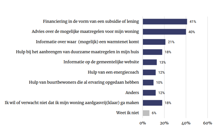 Er is vooral behoefte aan hulp in de vorm van financiering zoals een subsidie of lening (41%) en advies over mogelijke maatregelen in de woning (40%) op het moment dat inwoners overwegen een woning aardgasprijs te maken.