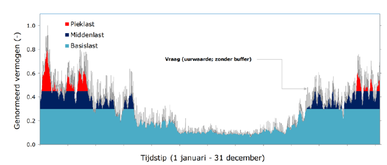 In de praktijk heeft een warmtenet doorgaans niet één maar meerdere bronnen nodig. Dat heeft te maken met het gebruik van warmte door het jaar heen. Zoals te zien in de grafiek in figuur 3.2 is de warmtevraag in de zomer zeer laag. Er worden dan geen ruimtes verwarmd en de enige warmtevraag die resteert is voor warm tapwater. Deze warmtevraag wordt de basislast genoemd. In het voor-en najaar stijgt de warmtevraag weer, omdat er behoefte aan ruimteverwarming ontstaat. Deze warmtevraag wordt de middenlast genoemd. In de winter is aanvullend extra behoefte aan verwarming op (zeer) koude dagen. Deze warmtevraag wordt pieklast genoemd. Zie figuur 3.2 voor een visuele weergave.