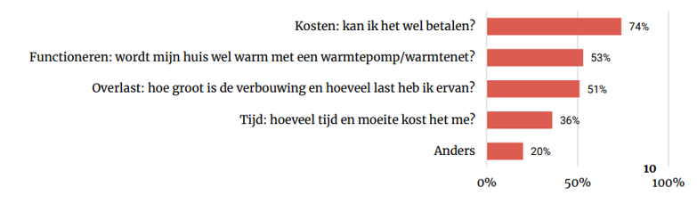 Aan de inwoners die zich zorgen maken over de overstap naar aardgasvrij wonen, is gevraagd waarover zij zich zorgen maken. De grootste zorgen hebben inwoners over de kosten van de overstap (74%). Ook vraagt de helft (53%) zich af of hun woning wel warm wordt met een warmtepomp of warmtenet. Daarnaast heeft ook de helft van deze inwoners (51%) zorgen over de overlast (zoals een verbouwing) die de overstap naar aardgasvrij wonen met zicht meebrengt.