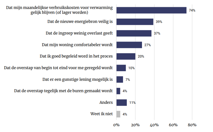 We vroegen inwoners wat voor hen het meest belangrijk is bij een overstap naar een andere warmtebron. Inwoners vinden het voornamelijk belangrijk dat de hun maandelijkse verbruikskosten voor verwarming gelijk blijven of lager worden (74%). E