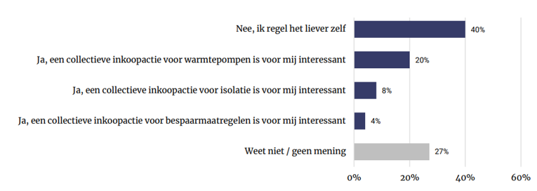 Naast warmtepompen en warmtenet zijn er nog meer maatregelen die inwoners kunnen nemen om energie te besparen. We vroegen inwoners of zij interesse zouden hebben om deel te nemen aan collectieve inkoopacties. Twee op de vijf inwoners geven aan dat zij hier geen interesse in hebben en dit liever zelf regelen.