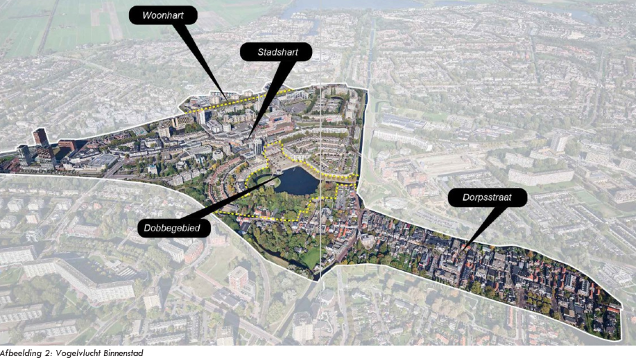 Een nieuw ontworpen stadscentrum als kloppend hart voor de stad. Een stadshart is namelijk niet alleen een winkelcentrum. Het is een publieke plek voor alle stedelingen, waar het levendig en gezellig is en waar men vaker komt en langer blijft dan nodig. De binnenstad is een sterke concentratie van alle facetten uit de samenleving en is divers van karakter. Daarom bestaat de binnenstad uit een mix van winkels, horeca, warenhuizen, kantoren, bioscopen een theater, sport en woningen. De stedenbouwkundige opzet kenmerkt zich door een compacte bouw met nauwe straten met laag-of middelhoogbouw. Slechts op enkele plekken is hoogbouw mogelijk. Een mix van wonen en werken op gebouwniveau met stedelijke plinten is afgeleid van historische binnensteden.