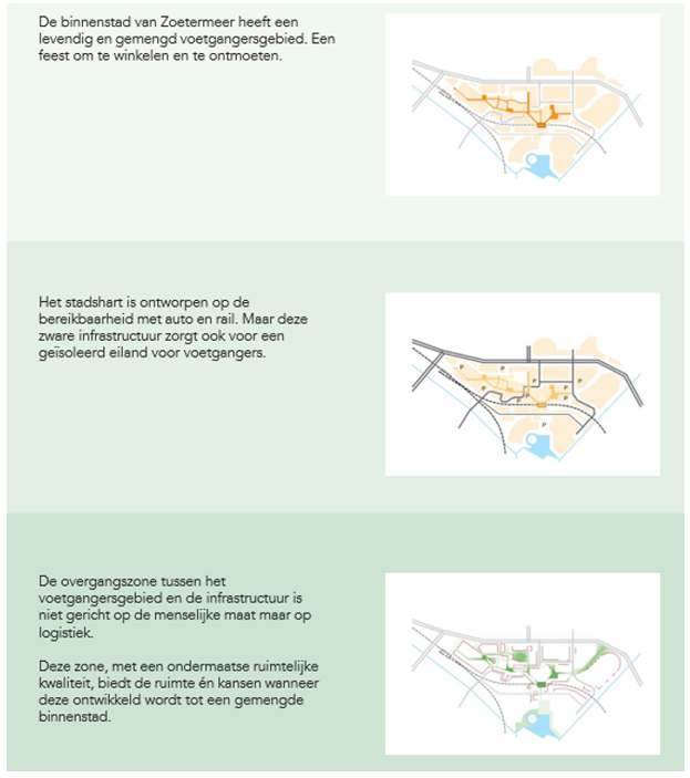 In het Zoetermeerse stadshart gaan nieuwe ontwikkelingen bijdragen aan aantrekkelijke binnenstad, waar men kan winkelen, werken, wonen, reizen en ontspannen. Deze ambitie vraagt om een integraal verhaal: van stedenbouw tot buitenruimte tot architectuur.