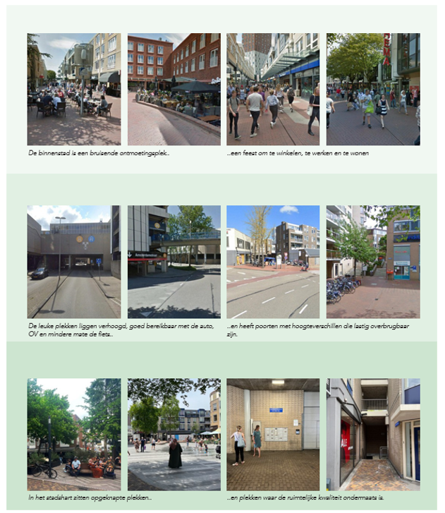 Zo is ontworpen aan karakteristieke routes, drukte-en stiltegebieden, arcades en aansluitende gebouwen. De hoofdroute heeft de vorm van een lange promenade met plekken waar je je kan oriënteren. Deze oriëntatiepunten zijn herkenbaar in de vorm van een plein, gebouw of bijvoorbeeld een boom. Ze vormen samen met de promenade de identiteit van het stadshart.