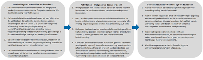 De indicatoren hierbij betreffen het aantal 1) tijdig en juist afgehandelde telefoonnotities, 2) binnen de (gecommuniceerde) beslistermijn genomen besluiten op verzoeken om handhaving en 3) het aantal controlerapporten dat binnen de beoogde termijn wordt opgemaakt en gecommuniceerd. Deze activiteiten leveren niet direct een bijdrage aan de gestelde strategische doelen. Deze activiteiten sluiten wel aan bij de wens om de dienstverlening van VTH te optimaliseren (hoofdlijnenakkoord).
