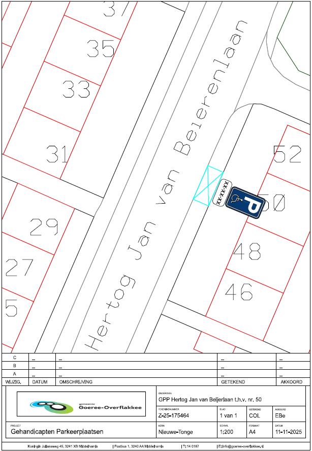 tot het aanwijzen van een gehandicaptenparkeerplaats op kenteken in de Hertog Jan van Beierenlaan, in de langsparkeervakken nabij de woning met huisnummer 50 te Nieuwe-Tonge, door het plaatsen van verkeersbord E06 met onderbord OB309 met daarop het kenteken van de aanvrager conform model van bijlage I van het Reglement Verkeersregels en Verkeerstekens 1990;