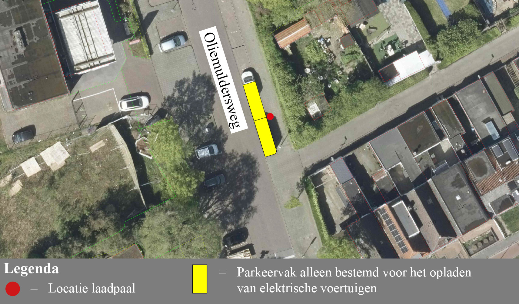 Er is een aanvraag ingediend om een oplaadpunt te realiseren. De gemeente Groningen beoordeelt een ingekomen aanvraag op basis van de ‘Plaatsingsleidraad openbare laadinfrastructuur’ (terug te vinden in de ‘Visie Openbare Laadinfrastructuur Groningen 2025’) en het document ‘Afwegingscriteria Openbare Laadinfrastructuur’ (terug te vinden op de gemeentelijke website), welke een uitwerking is van de ‘Visie Openbare Laadinfrastructuur Groningen 2025’. Op basis van deze plaatsingsleidraad en afwegingscriteria is aan de zuidoostzijde van de Oliemuldersweg bij de parkeerstrook ter plaatse van nummer 41 een geschikte locatie gekozen om een laadpaal te plaatsen.