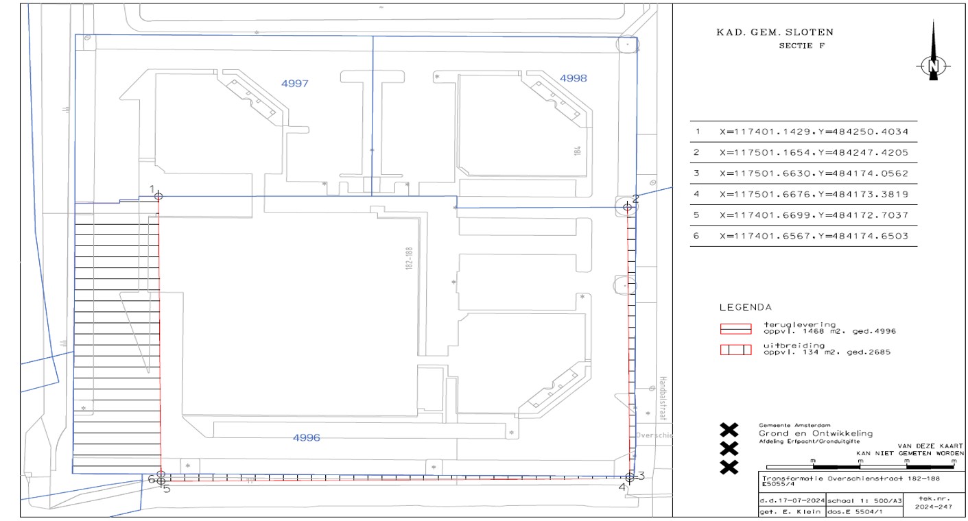 De gemeente Amsterdam (hierna: Gemeente) en de erfpachter hebben op 24 mei 2022 een Afsprakenbrief ondertekend, gevolgd door een realisatieovereenkomst op 28 juli 2024, waarin afspraken over transformatie van het Perceel zijn vastgelegd. Om deze transformatie mogelijk te maken heeft de Gemeente het voornemen om in totaal ca. 134 m² grond ten zuiden van het bestaande Perceel als perceeluitbreiding aan de erfpachter in erfpacht uit te geven in het kader van een grondruil. In ruil hiervoor zal circa 1.468 m² grond, gelegen aan de west- en zuidzijde van het huidige perceel, om niet aan de Gemeente worden terug geleverd. Het in erfpacht uit te geven perceel staat op onderstaande kaart aangegeven met verticaal lopende arcering ten zuiden van het plangebied.