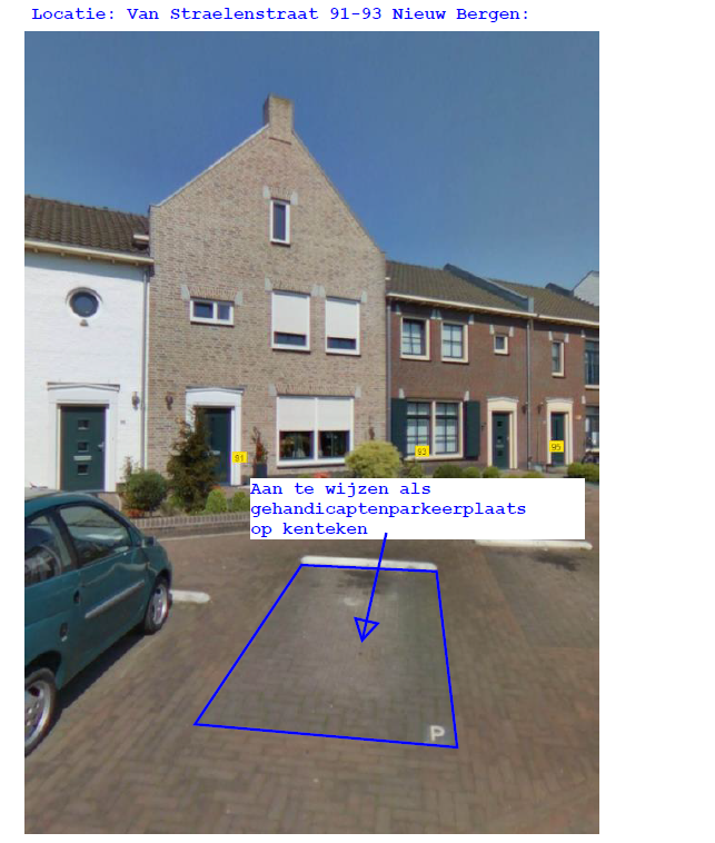 Verkeersbesluit voor de aanleg van een gereserveerde gehandicaptenparkeerplaats aan Van Straelenstraat te Nieuw Bergen (L.)
