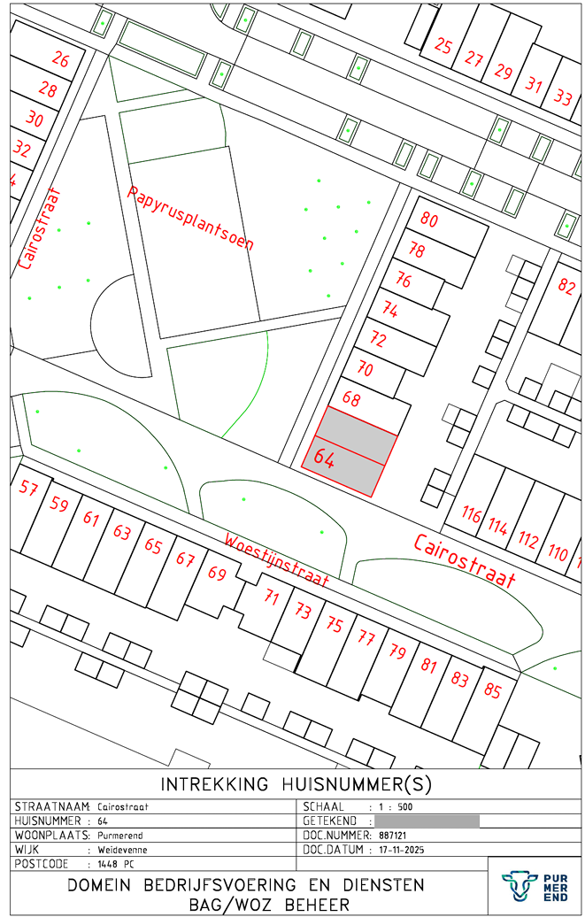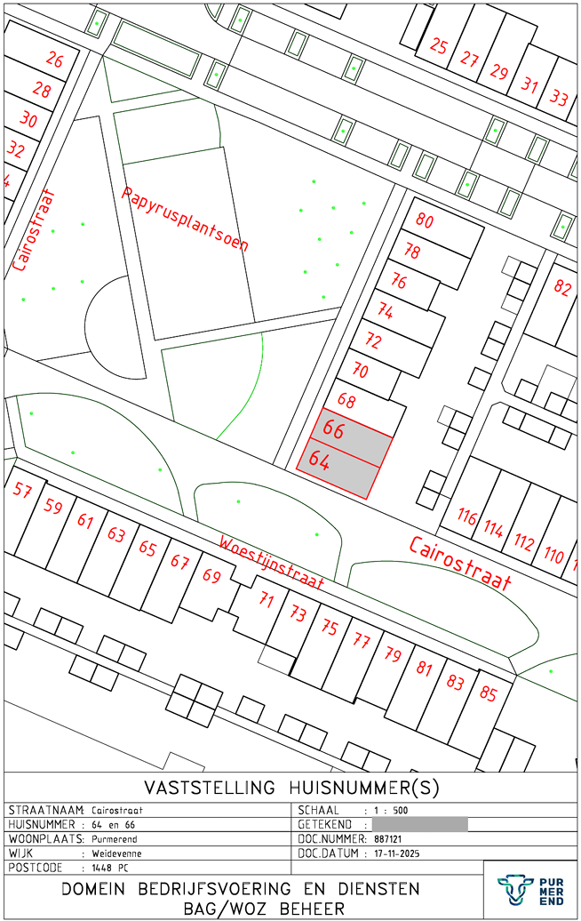 Kennisgeving huisnummerbesluit Cairostraat 64 en 66 te Purmerend